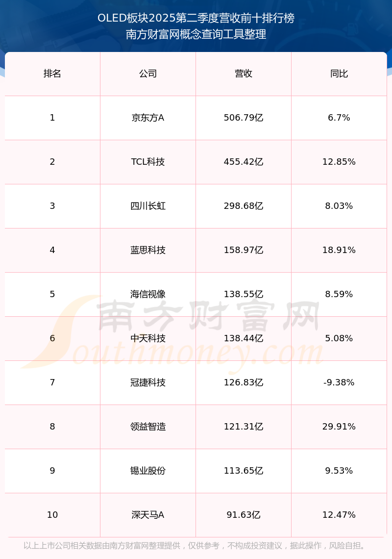 按照南方財(cái)富網(wǎng)概念查詢工具統(tǒng)計(jì),該股所屬板塊為OLED板塊,該板塊共有182只股票,瑞聯(lián)新材2025第二季度營(yíng)收在該板塊中排名為第116名,該板塊2025第二季度營(yíng)收排名前十的股票如下表: