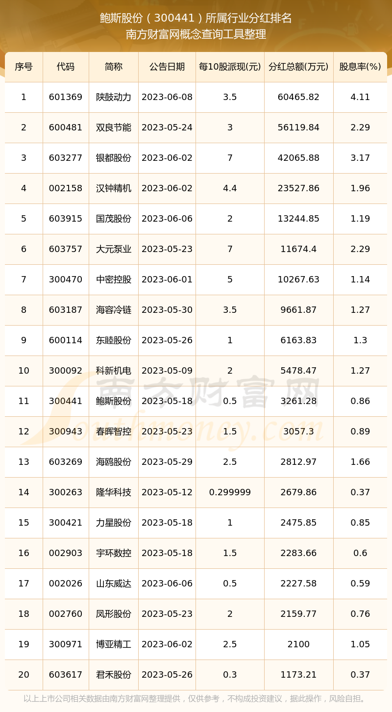 按照南方財富網(wǎng)趨勢選股系統(tǒng)統(tǒng)計,鮑斯股份所屬行業(yè)為壓縮機行業(yè),壓縮機行業(yè)分紅排名情況如下表: