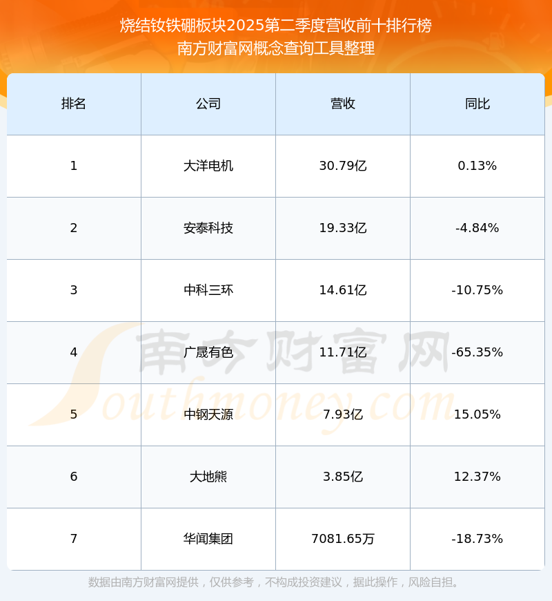 按照南方財富網(wǎng)概念查詢工具統(tǒng)計,該股所屬板塊為燒結釹鐵硼板塊,該板塊共有7只股票,大地熊2025第二季度營收在該板塊中排名為第6名,該板塊2025第二季度營收排名前十的股票如下表: