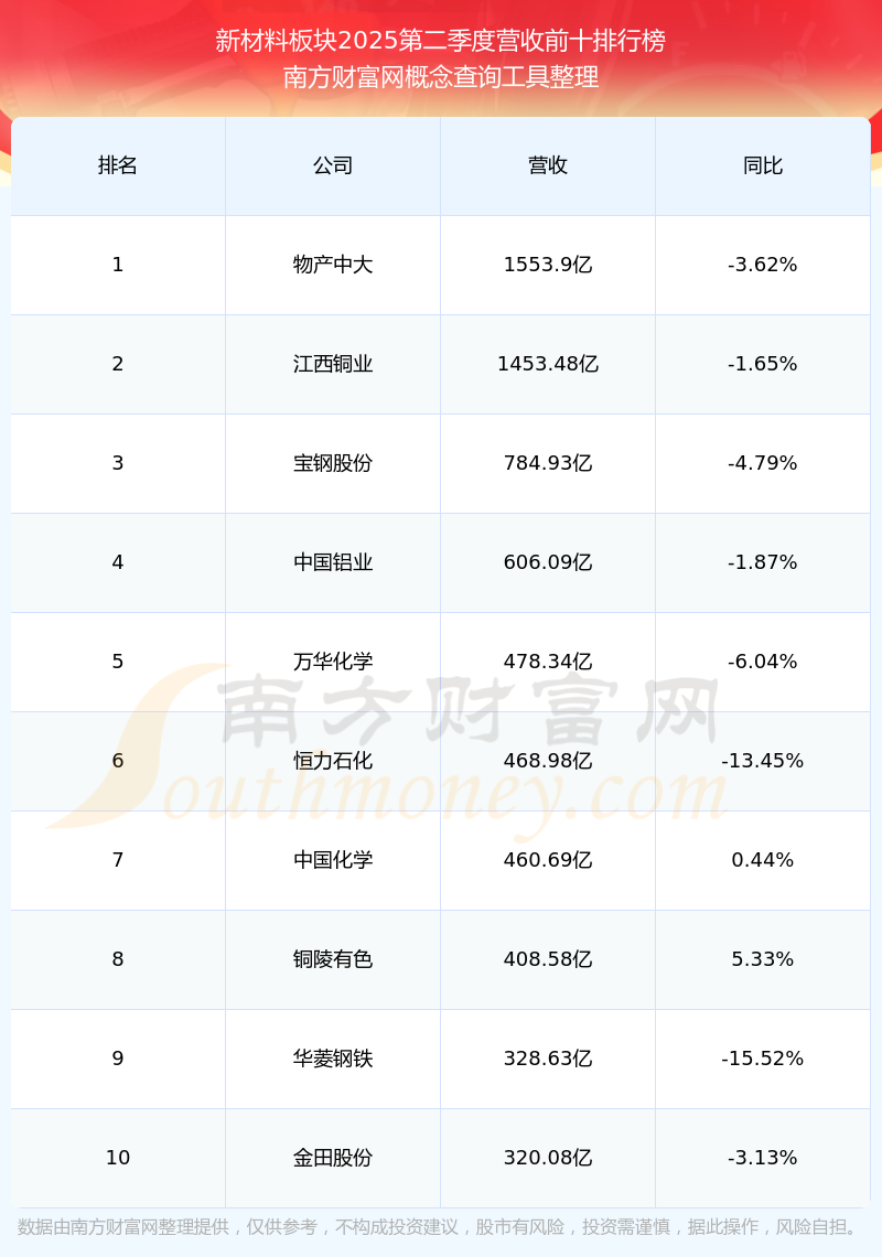 按照南方財富網(wǎng)概念查詢工具統(tǒng)計,該股所屬板塊為新材料板塊,該板塊共有564只股票,諾德股份2025第二季度營收在該板塊中排名為第156名,該板塊2025第二季度營收排名前十的股票如下表: