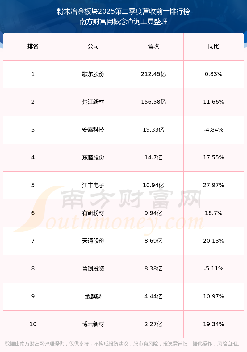 按照南方財(cái)富網(wǎng)概念查詢工具統(tǒng)計(jì),該股所屬板塊為粉末冶金板塊,該板塊共有13只股票,魯銀投資2025第二季度營(yíng)收在該板塊中排名為第8名,該板塊2025第二季度營(yíng)收排名前十的股票如下表: