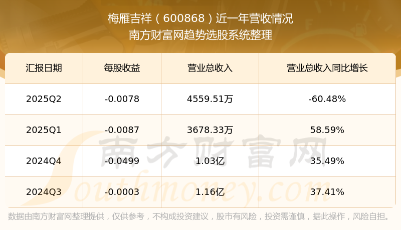梅雁吉祥發(fā)布2025年第二季度財報。實(shí)現(xiàn)總營收4559.51萬元,同比增長-60.48%;扣非凈利潤同比增長-166.74%至-1455.16萬元。