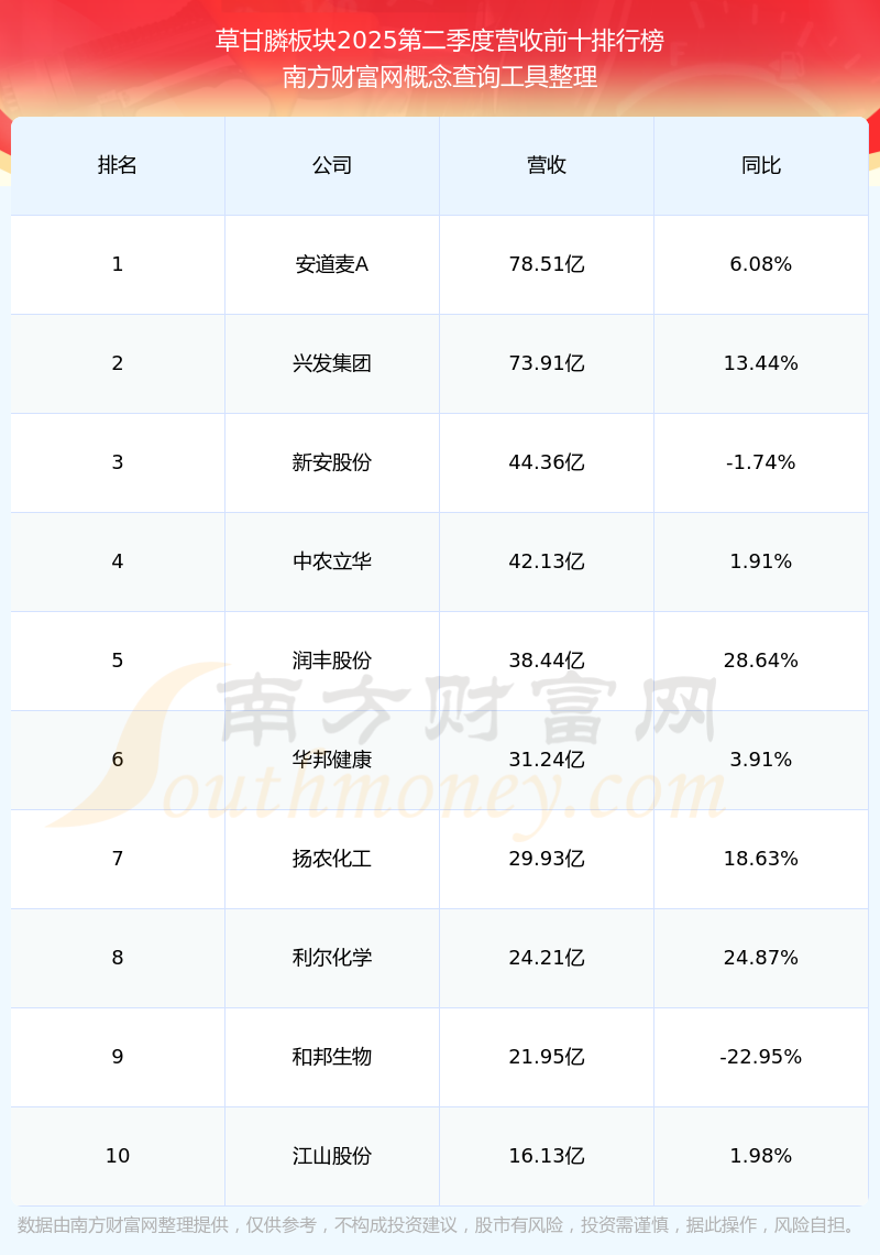按照南方財(cái)富網(wǎng)概念查詢工具統(tǒng)計(jì),該股所屬板塊為草甘膦板塊,該板塊共有24只股票,興發(fā)集團(tuán)2025第二季度營收在該板塊中排名為第2名,該板塊2025第二季度營收排名前十的股票如下表: