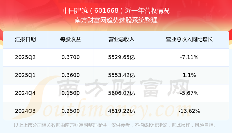 中國建筑披露了2025年第二季度財報。報告顯示,中國建筑2025年第二季度實現(xiàn)營收5529.65億元,同比-7.11%;歸母凈利潤153.91億元,同比5.94%。