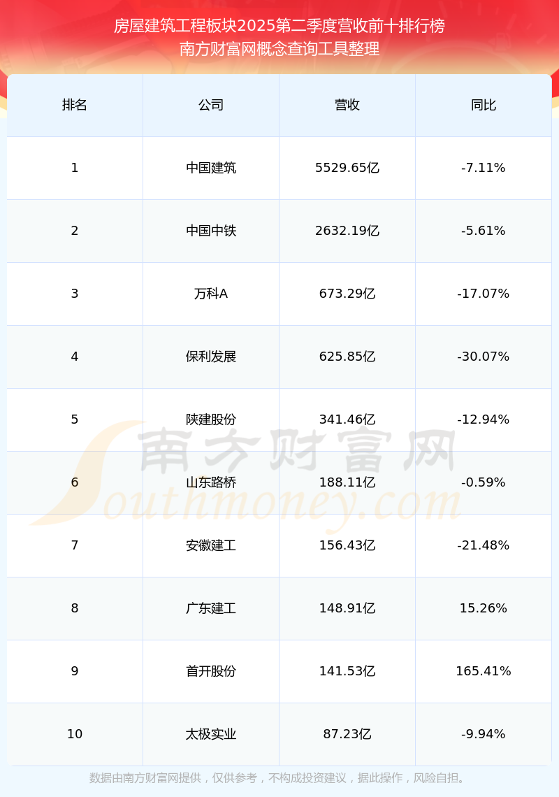 按照南方財富網(wǎng)概念查詢工具統(tǒng)計,該股所屬板塊為房屋建筑工程板塊,該板塊共有44只股票,中國建筑2025第二季度營收在該板塊中排名為第1名,該板塊2025第二季度營收排名前十的股票如下表: