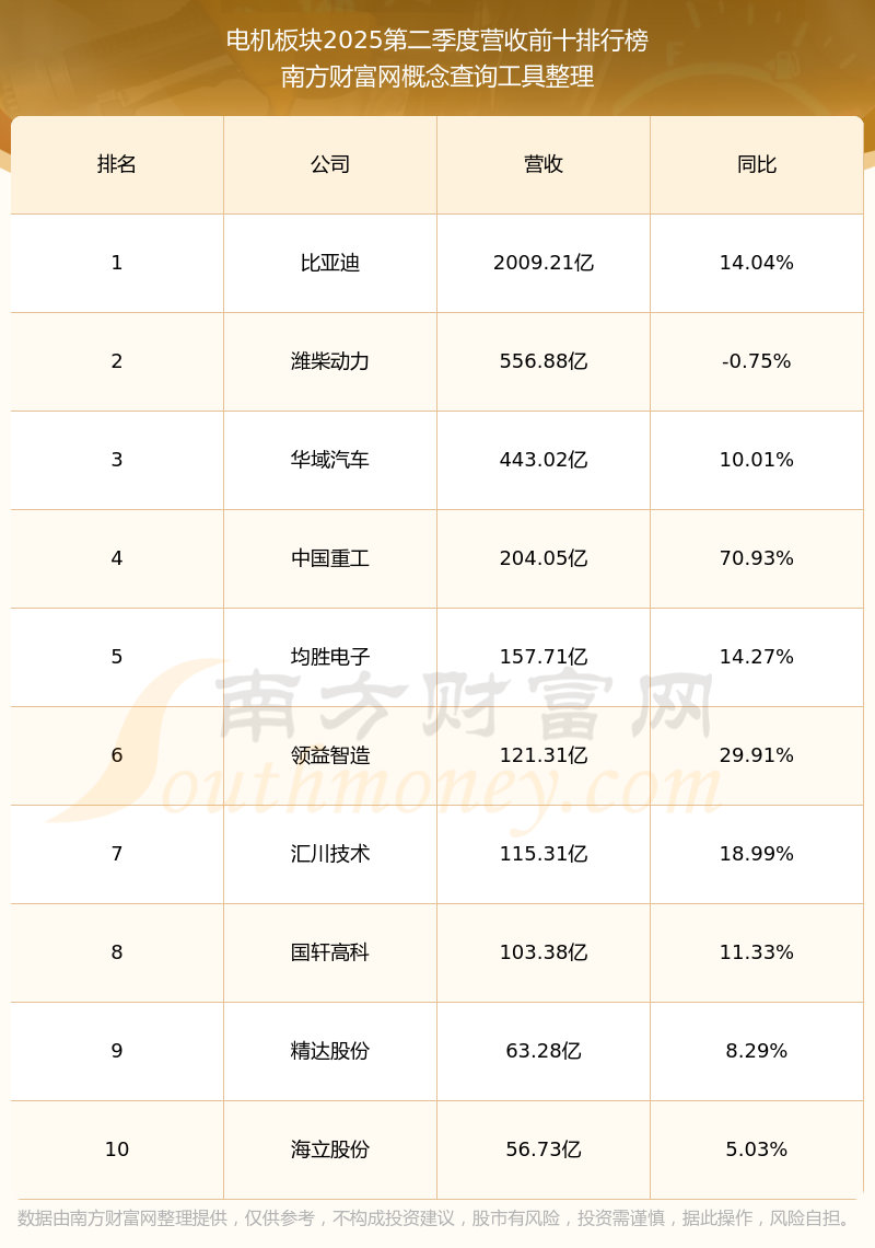 按照南方財富網(wǎng)概念查詢工具統(tǒng)計,該股所屬板塊為電機板塊,該板塊共有113只股票,星德勝2025第二季度營收在該板塊中排名為第53名,該板塊2025第二季度營收排名前十的股票如下表: