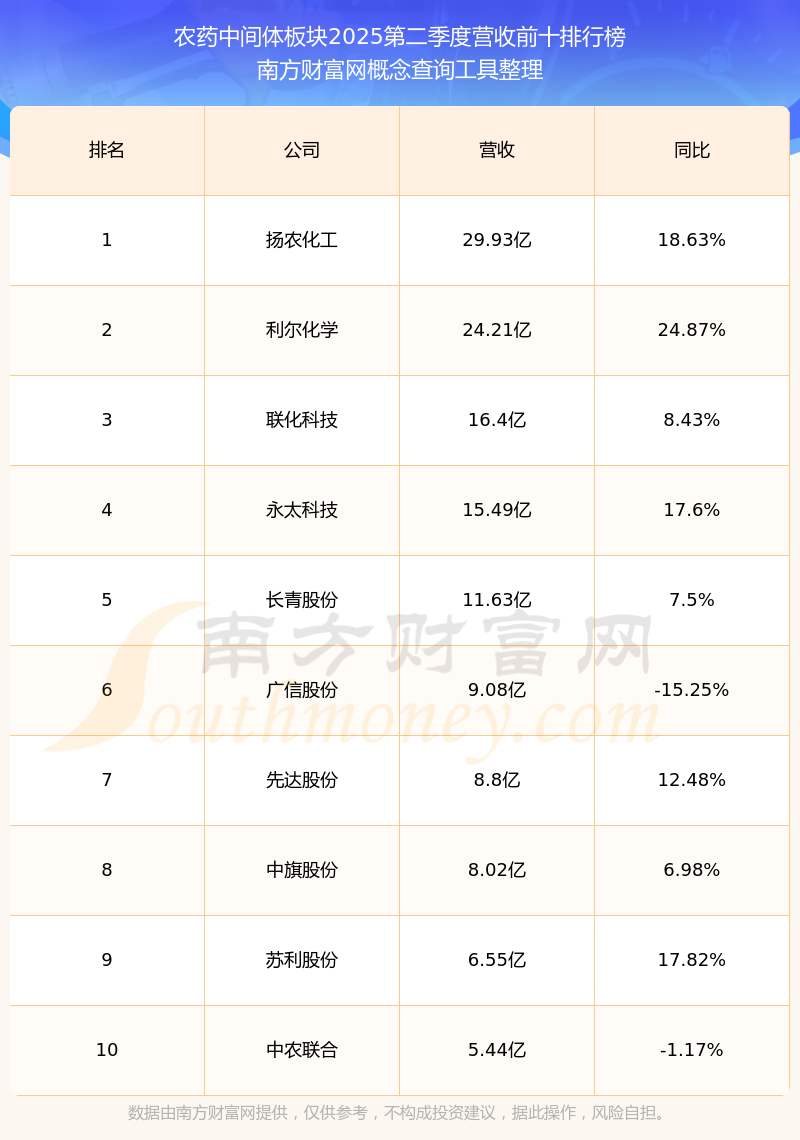 按照南方財(cái)富網(wǎng)概念查詢工具統(tǒng)計(jì),該股所屬板塊為農(nóng)藥中間體板塊,該板塊共有21只股票,醋化股份2025第二季度營收在該板塊中排名為第21名,該板塊2025第二季度營收排名前十的股票如下表: