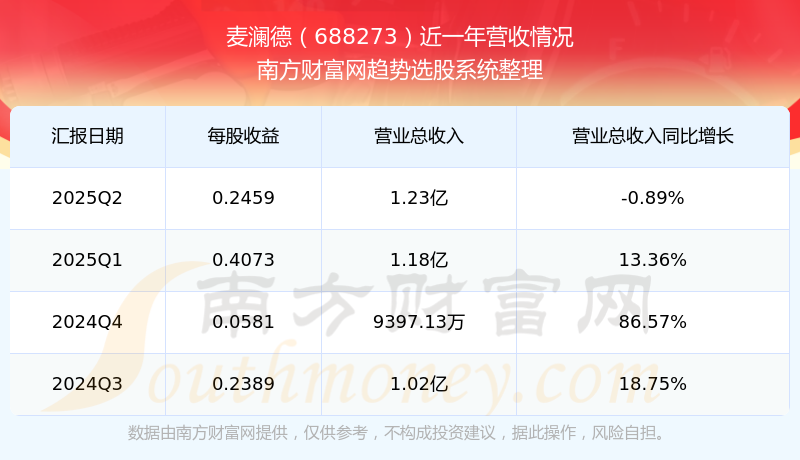 在2025年第二季度,麥瀾德的業(yè)績表現(xiàn),主營業(yè)務收入達到1.23億元,實現(xiàn)了-0.89%的同比增長率。同時,公司歸母凈利潤錄得2406.04萬元,同比增長-33.76%。