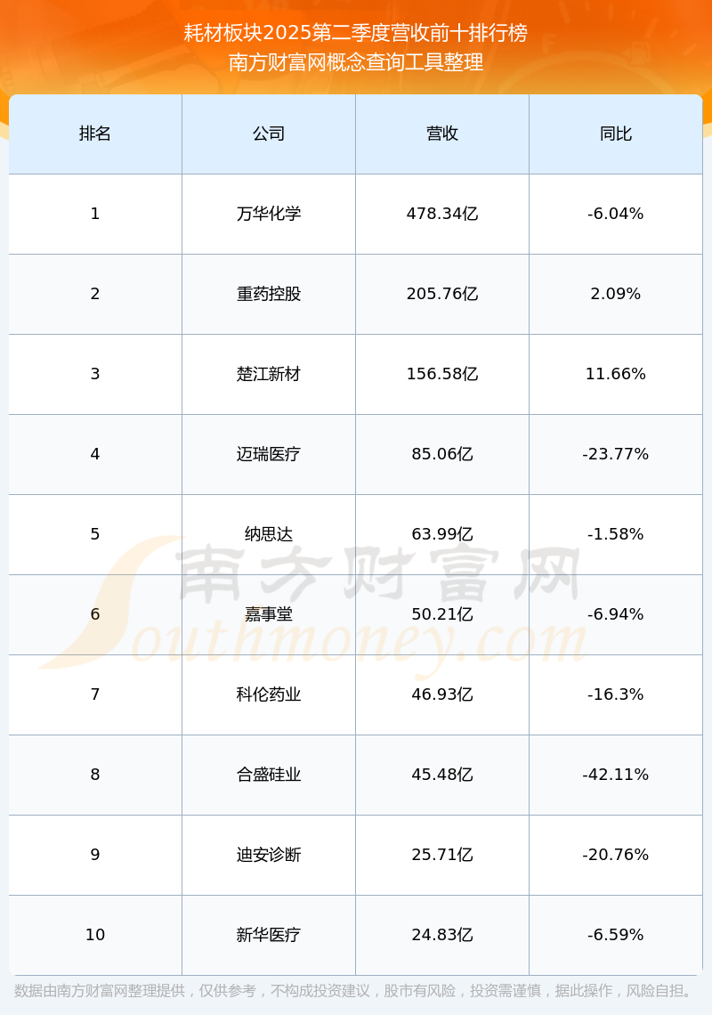 按照南方財富網概念查詢工具統(tǒng)計,該股所屬板塊為耗材板塊,該板塊共有65只股票,麥瀾德2025第二季度營收在該板塊中排名為第65名,該板塊2025第二季度營收排名前十的股票如下表: