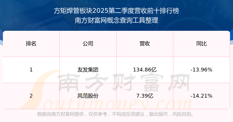 按照南方財(cái)富網(wǎng)概念查詢工具統(tǒng)計(jì),該股所屬板塊為方矩焊管板塊,該板塊共有2只股票,友發(fā)集團(tuán)2025第二季度營收在該板塊中排名為第1名,該板塊2025第二季度營收排名前十的股票如下表: