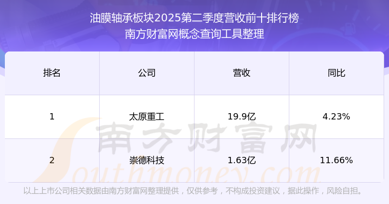 按照南方財(cái)富網(wǎng)概念查詢工具統(tǒng)計(jì),該股所屬板塊為油膜軸承板塊,該板塊共有2只股票,太原重工2025第二季度營(yíng)收在該板塊中排名為第1名,該板塊2025第二季度營(yíng)收排名前十的股票如下表: