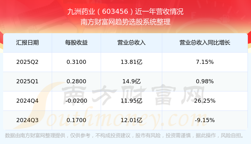 九洲藥業(yè)披露了2025年第二季度財(cái)報(bào)。報(bào)告顯示,九洲藥業(yè)2025年第二季度實(shí)現(xiàn)營收13.81億元,同比7.15%;歸母凈利潤2.76億元,同比15.7%。