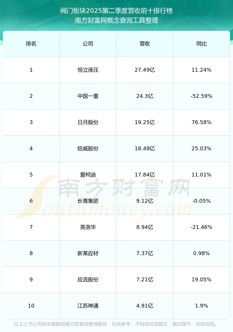 按照南方財(cái)富網(wǎng)概念查詢(xún)工具統(tǒng)計(jì),該股所屬板塊為閥門(mén)板塊,該板塊共有22只股票,應(yīng)流股份2025第二季度營(yíng)收在該板塊中排名為第9名,該板塊2025第二季度營(yíng)收排名前十的股票如下表:
