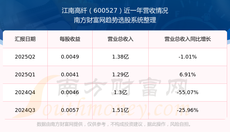在2025年第二季度,江南高纖的業(yè)績(jī)表現(xiàn),主營(yíng)業(yè)務(wù)收入達(dá)到1.38億元,實(shí)現(xiàn)了-1.01%的同比增長(zhǎng)率。同時(shí),公司歸母凈利潤(rùn)錄得853.38萬(wàn)元,同比增長(zhǎng)-37.83%。
