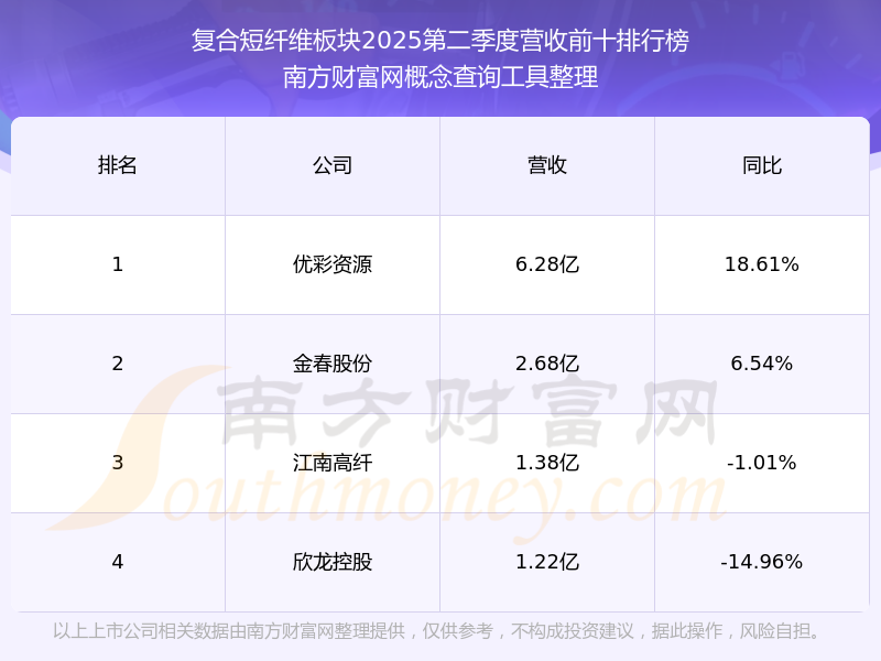 按照南方財(cái)富網(wǎng)概念查詢工具統(tǒng)計(jì),該股所屬板塊為復(fù)合短纖維板塊,該板塊共有4只股票,江南高纖2025第二季度營(yíng)收在該板塊中排名為第3名,該板塊2025第二季度營(yíng)收排名前十的股票如下表:
