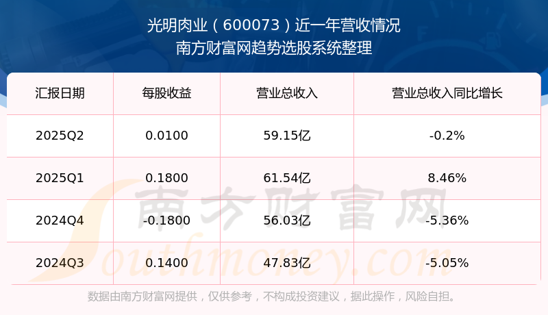 光明肉業(yè)(600073)發(fā)布2025年第二季度財報。2025年第二季度光明肉業(yè)實現(xiàn)營業(yè)收入59.15億元,同比增加-0.2元%,環(huán)比增加-3.88%;凈利潤為1034.8萬元,同比增長-93.28%,環(huán)比增長-93.75%。