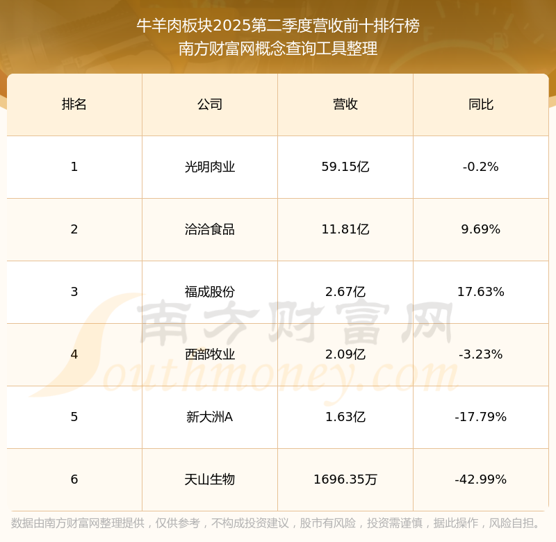 按照南方財富網(wǎng)概念查詢工具統(tǒng)計,該股所屬板塊為牛羊肉板塊,該板塊共有6只股票,光明肉業(yè)2025第二季度營收在該板塊中排名為第1名,該板塊2025第二季度營收排名前十的股票如下表: