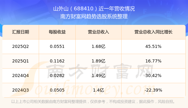 山外山2025年第二季度顯示,公司主營(yíng)收入1.68億元,同比45.51%;歸母凈利潤(rùn)1803.22萬元,同比56.47%;扣非凈利潤(rùn)1576.71萬元,同比71.07%。