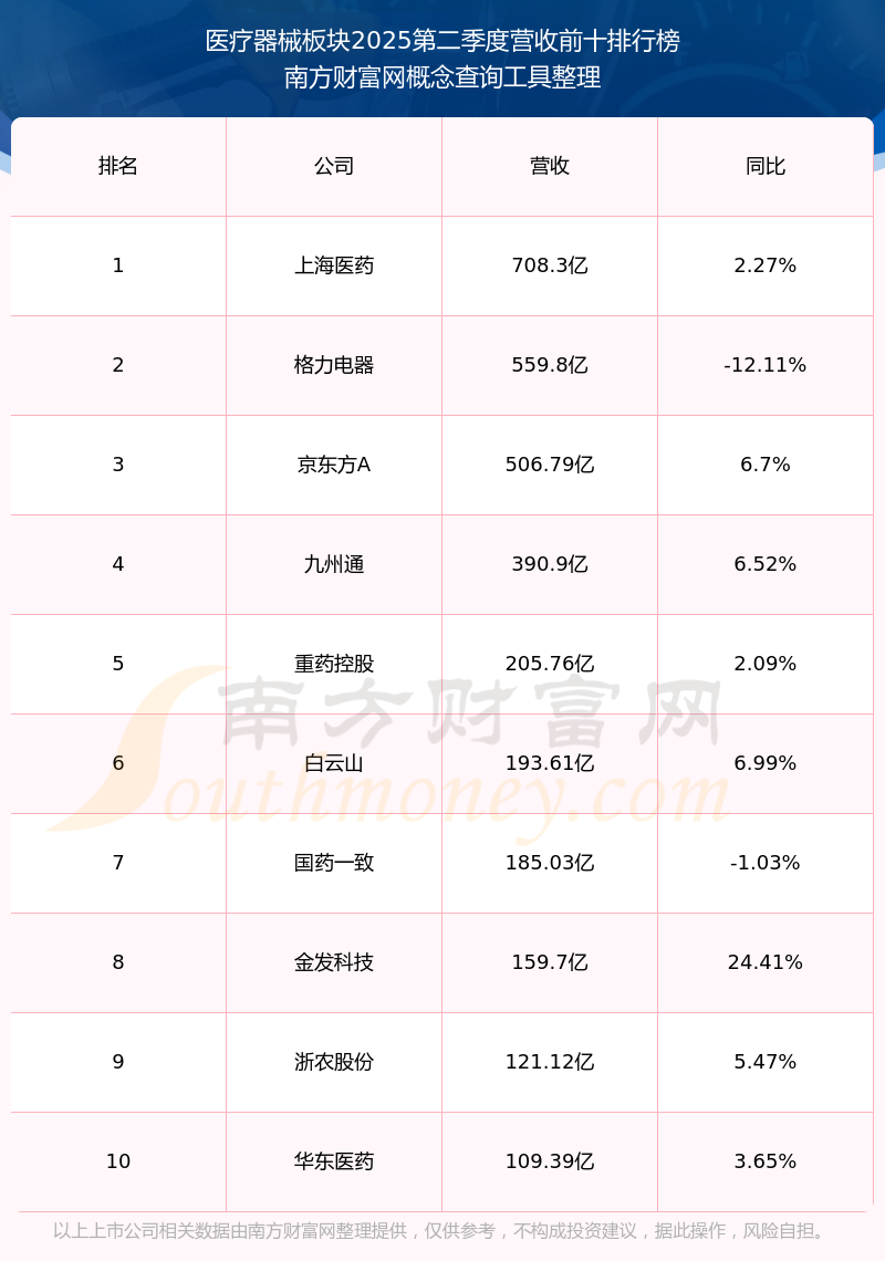 按照南方財(cái)富網(wǎng)概念查詢工具統(tǒng)計(jì),該股所屬板塊為醫(yī)療器械板塊,該板塊共有405只股票,山外山2025第二季度營(yíng)收在該板塊中排名為第302名,該板塊2025第二季度營(yíng)收排名前十的股票如下表: