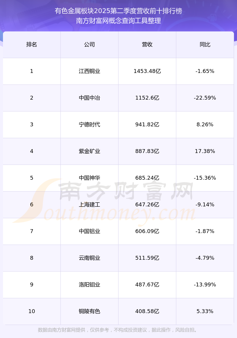 按照南方財(cái)富網(wǎng)概念查詢工具統(tǒng)計(jì),該股所屬板塊為有色金屬板塊,該板塊共有289只股票,華鈺礦業(yè)2025第二季度營(yíng)收在該板塊中排名為第216名,該板塊2025第二季度營(yíng)收排名前十的股票如下表: