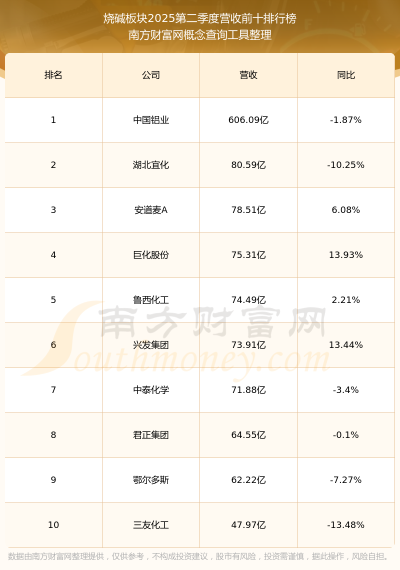 按照南方財(cái)富網(wǎng)概念查詢工具統(tǒng)計(jì),該股所屬板塊為燒堿板塊,該板塊共有38只股票,濱化股份2025第二季度營(yíng)收在該板塊中排名為第11名,該板塊2025第二季度營(yíng)收排名前十的股票如下表: