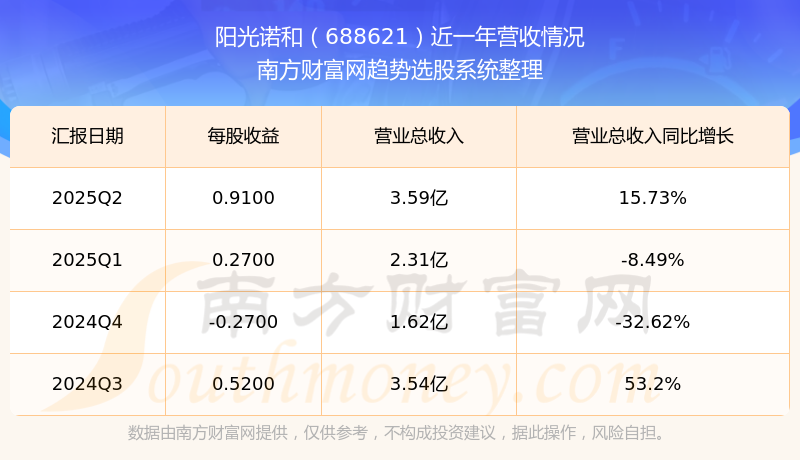 陽(yáng)光諾和2025年第二季度財(cái)報(bào)顯示,公司主營(yíng)收入3.59億元,同比15.73%;歸母凈利潤(rùn)1億元,同比32.23%;扣非凈利潤(rùn)9947.22萬(wàn)元,同比30.28%;