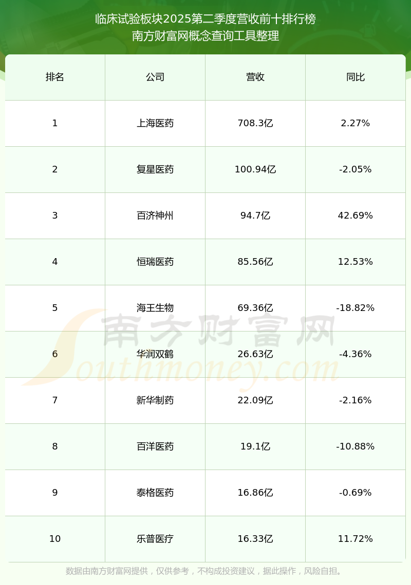 按照南方財(cái)富網(wǎng)概念查詢工具統(tǒng)計(jì),該股所屬板塊為臨床試驗(yàn)板塊,該板塊共有57只股票,陽(yáng)光諾和2025第二季度營(yíng)收在該板塊中排名為第33名,該板塊2025第二季度營(yíng)收排名前十的股票如下表:
