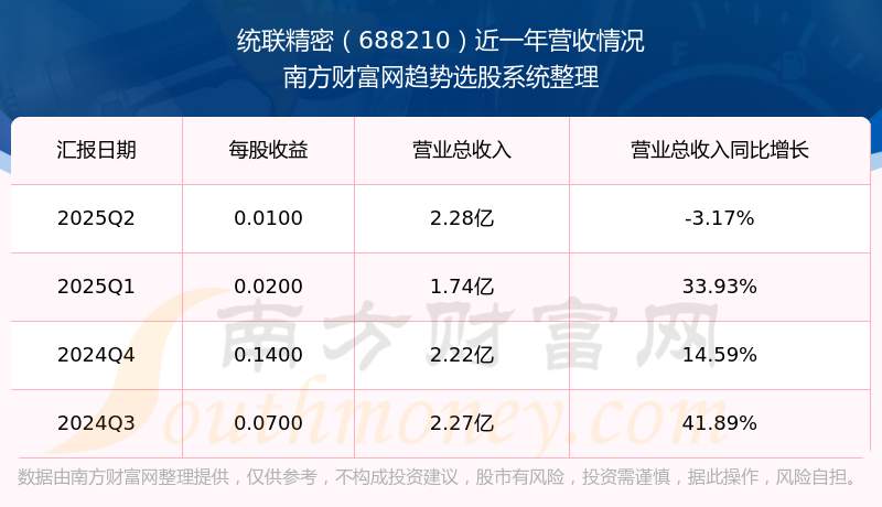 統(tǒng)聯(lián)精密(688210)發(fā)布2025年第二季度財(cái)報(bào)。2025年第二季度統(tǒng)聯(lián)精密實(shí)現(xiàn)營業(yè)收入2.28億元,同比增加-3.17元%,環(huán)比增加31.14%;凈利潤為213.04萬元,同比增長-92.04%,環(huán)比增長-22.33%。