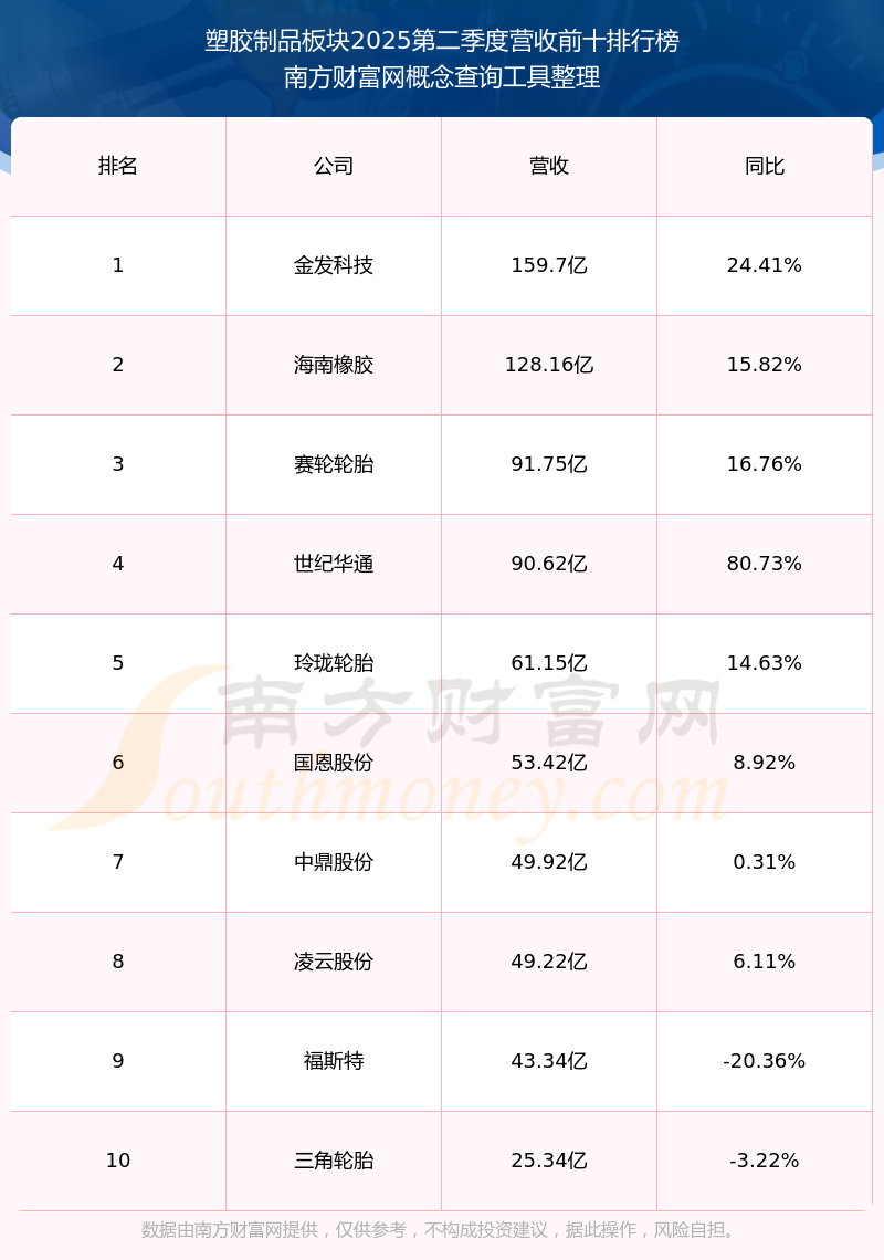 按照南方財(cái)富網(wǎng)概念查詢工具統(tǒng)計(jì),該股所屬板塊為塑膠制品板塊,該板塊共有77只股票,統(tǒng)聯(lián)精密2025第二季度營收在該板塊中排名為第77名,該板塊2025第二季度營收排名前十的股票如下表: