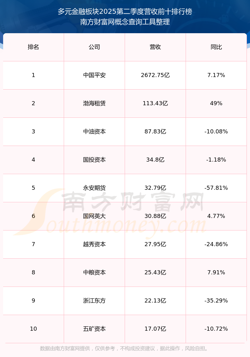 按照南方財(cái)富網(wǎng)概念查詢工具統(tǒng)計(jì),該股所屬板塊為多元金融板塊,該板塊共有35只股票,江蘇金租2025第二季度營收在該板塊中排名為第12名,該板塊2025第二季度營收排名前十的股票如下表: