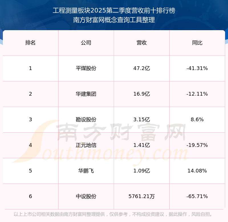 按照南方財(cái)富網(wǎng)概念查詢工具統(tǒng)計(jì),該股所屬板塊為工程測(cè)量板塊,該板塊共有6只股票,正元地信2025第二季度營(yíng)收在該板塊中排名為第4名,該板塊2025第二季度營(yíng)收排名前十的股票如下表: