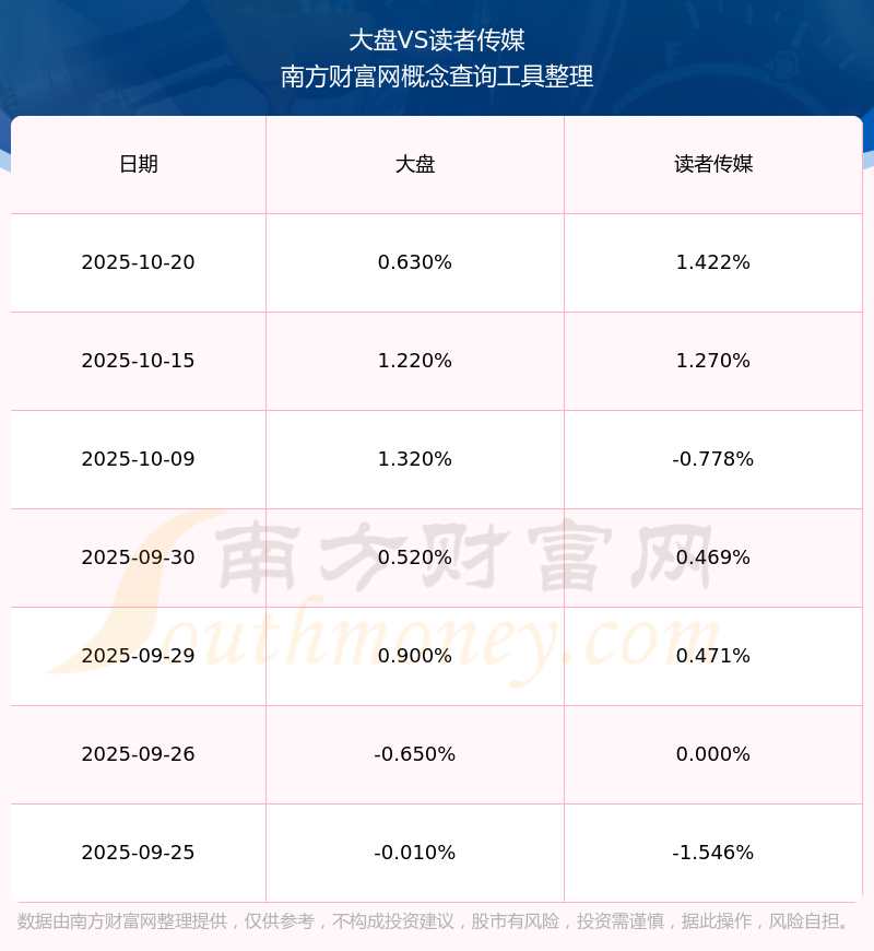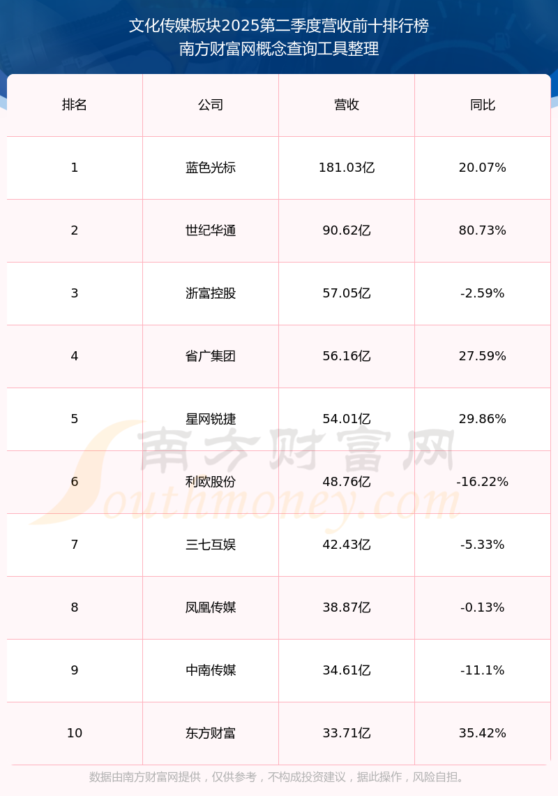 按照南方財(cái)富網(wǎng)概念查詢工具統(tǒng)計(jì),該股所屬板塊為文化傳媒板塊,該板塊共有240只股票,讀者傳媒2025第二季度營(yíng)收在該板塊中排名為第144名,該板塊2025第二季度營(yíng)收排名前十的股票如下表: