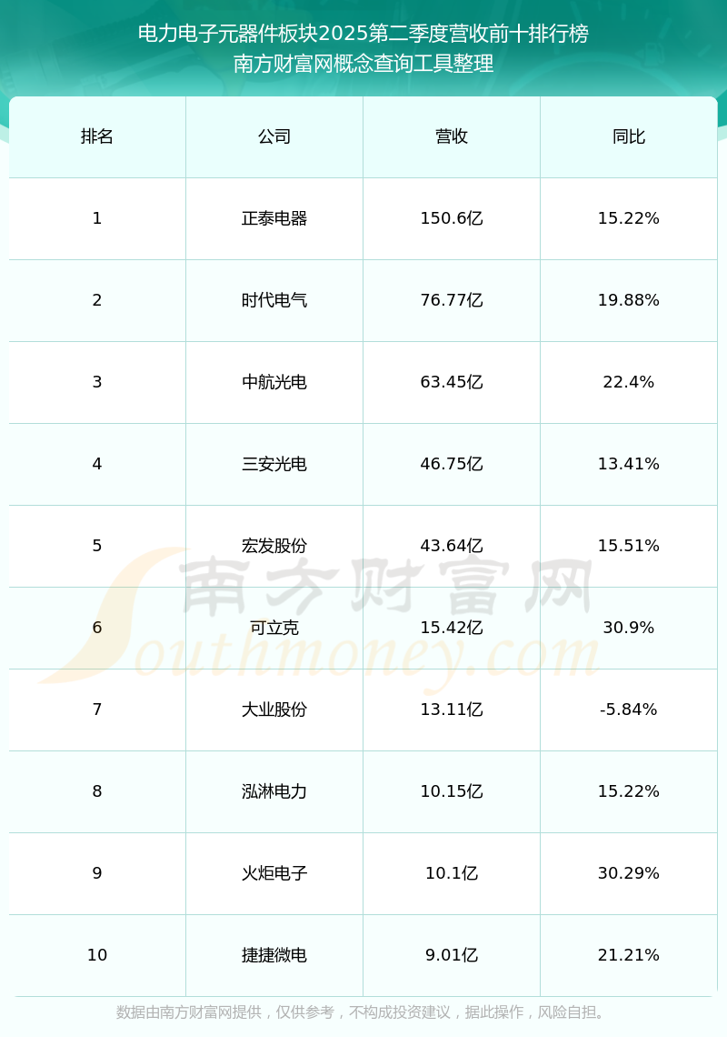按照南方財(cái)富網(wǎng)概念查詢工具統(tǒng)計(jì),該股所屬板塊為電力電子元器件板塊,該板塊共有32只股票,新風(fēng)光2025第二季度營(yíng)收在該板塊中排名為第32名,該板塊2025第二季度營(yíng)收排名前十的股票如下表: