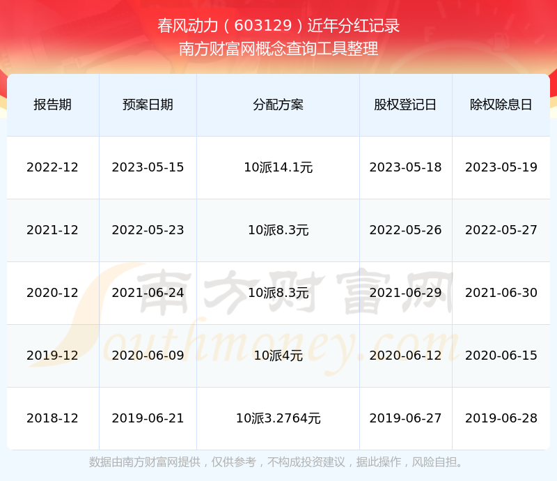 春風(fēng)動力最新一次公布的分紅方案為10派14.1元。本次權(quán)益分派股權(quán)登記日為2023年5月18日,除權(quán)除息日為2023年5月19日,派息日為2023年5月19日。
