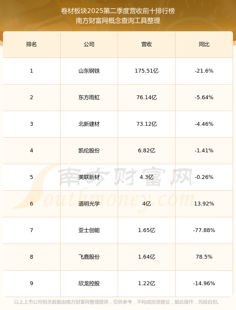 按照南方財富網(wǎng)概念查詢工具統(tǒng)計,該股所屬板塊為卷材板塊,該板塊共有9只股票,山東鋼鐵2025第二季度營收在該板塊中排名為第1名,該板塊2025第二季度營收排名前十的股票如下表: