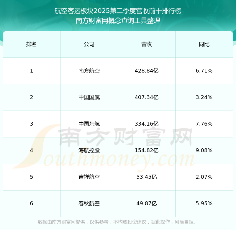 按照南方財富網(wǎng)概念查詢工具統(tǒng)計,該股所屬板塊為航空客運板塊,該板塊共有6只股票,春秋航空2025第二季度營收在該板塊中排名為第6名,該板塊2025第二季度營收排名前十的股票如下表: