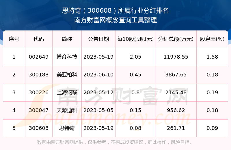 按照南方財(cái)富網(wǎng)趨勢(shì)選股系統(tǒng)統(tǒng)計(jì),思特奇所屬行業(yè)為軟件開發(fā)行業(yè),軟件開發(fā)行業(yè)分紅排名情況如下表: