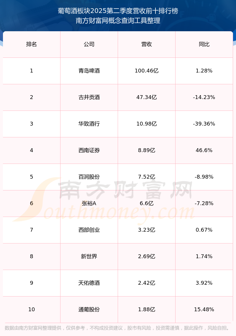 按照南方財富網(wǎng)概念查詢工具統(tǒng)計,該股所屬板塊為葡萄酒板塊,該板塊共有14只股票,中信尼雅2025第二季度營收在該板塊中排名為第13名,該板塊2025第二季度營收排名前十的股票如下表: