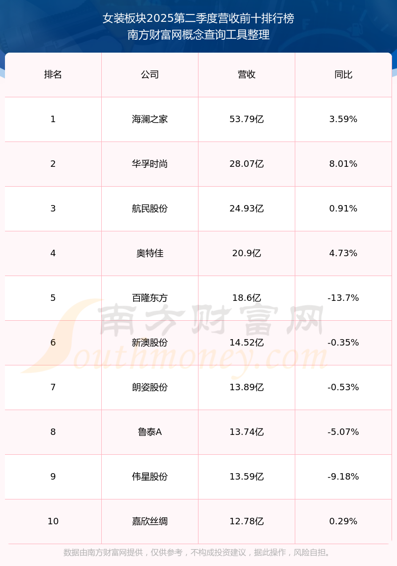 按照南方財富網(wǎng)概念查詢工具統(tǒng)計,該股所屬板塊為女裝板塊,該板塊共有28只股票,錦泓集團2025第二季度營收在該板塊中排名為第12名,該板塊2025第二季度營收排名前十的股票如下表: