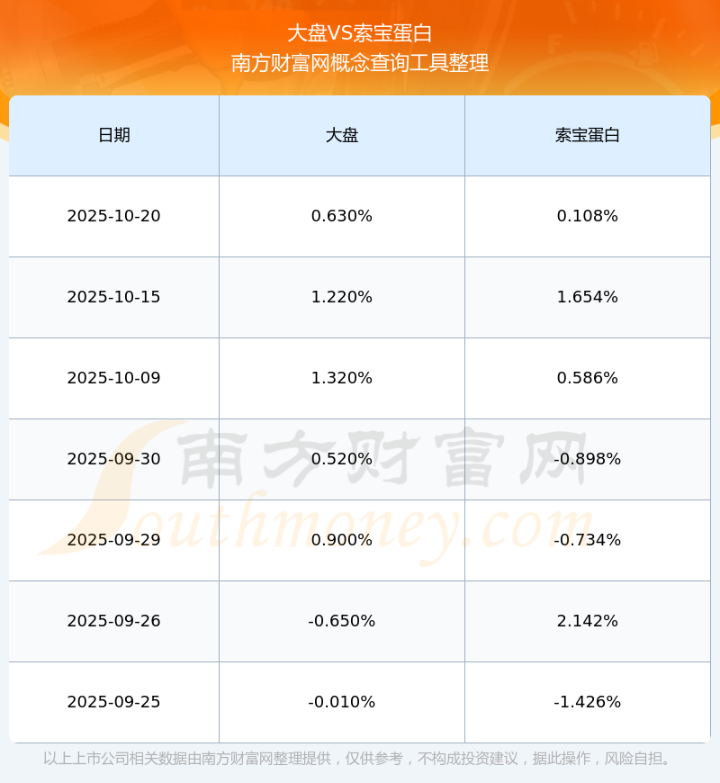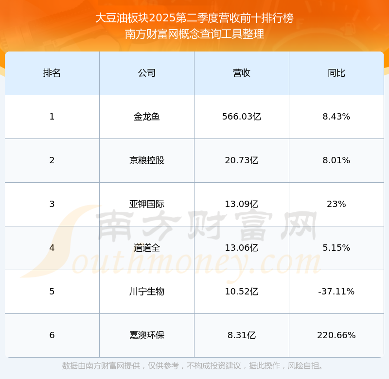 按照南方財(cái)富網(wǎng)概念查詢工具統(tǒng)計(jì),該股所屬板塊為大豆油板塊,該板塊共有6只股票,索寶蛋白2025第二季度營(yíng)收在該板塊中排名為第6名,該板塊2025第二季度營(yíng)收排名前十的股票如下表: