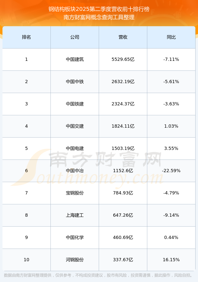按照南方財富網(wǎng)概念查詢工具統(tǒng)計,該股所屬板塊為鋼結(jié)構(gòu)板塊,該板塊共有46只股票,精工鋼構(gòu)2025第二季度營收在該板塊中排名為第25名,該板塊2025第二季度營收排名前十的股票如下表: