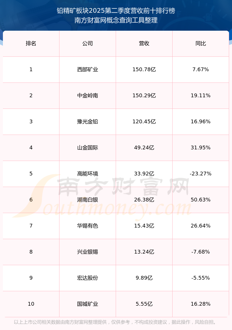 按照南方財(cái)富網(wǎng)概念查詢工具統(tǒng)計(jì),該股所屬板塊為鉛精礦板塊,該板塊共有14只股票,金徽股份2025第二季度營(yíng)收在該板塊中排名為第14名,該板塊2025第二季度營(yíng)收排名前十的股票如下表: