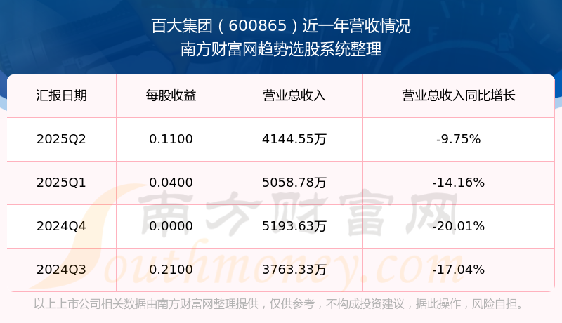 百大集團(tuán)2025年第二季度顯示,公司主營收入4144.55萬元,同比-9.75%;歸母凈利潤4104.72萬元,同比156.65%;扣非凈利潤1366.43萬元,同比-24.98%;
