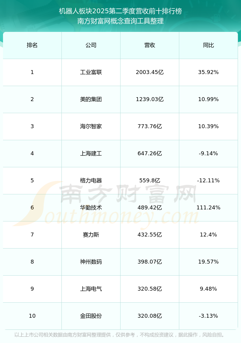 按照南方財富網(wǎng)概念查詢工具統(tǒng)計,該股所屬板塊為機器人板塊,該板塊共有780只股票,億嘉和2025第二季度營收在該板塊中排名為第666名,該板塊2025第二季度營收排名前十的股票如下表:
