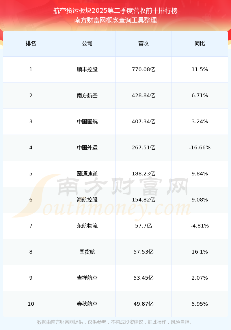 按照南方財(cái)富網(wǎng)概念查詢工具統(tǒng)計(jì),該股所屬板塊為航空貨運(yùn)板塊,該板塊共有15只股票,中國(guó)國(guó)航2025第二季度營(yíng)收在該板塊中排名為第3名,該板塊2025第二季度營(yíng)收排名前十的股票如下表:
