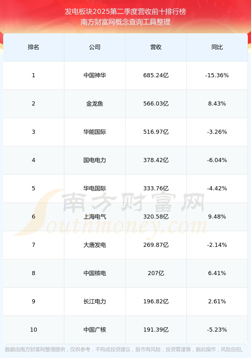 按照南方財富網(wǎng)概念查詢工具統(tǒng)計,該股所屬板塊為發(fā)電板塊,該板塊共有75只股票,華電國際2025第二季度營收在該板塊中排名為第5名,該板塊2025第二季度營收排名前十的股票如下表: