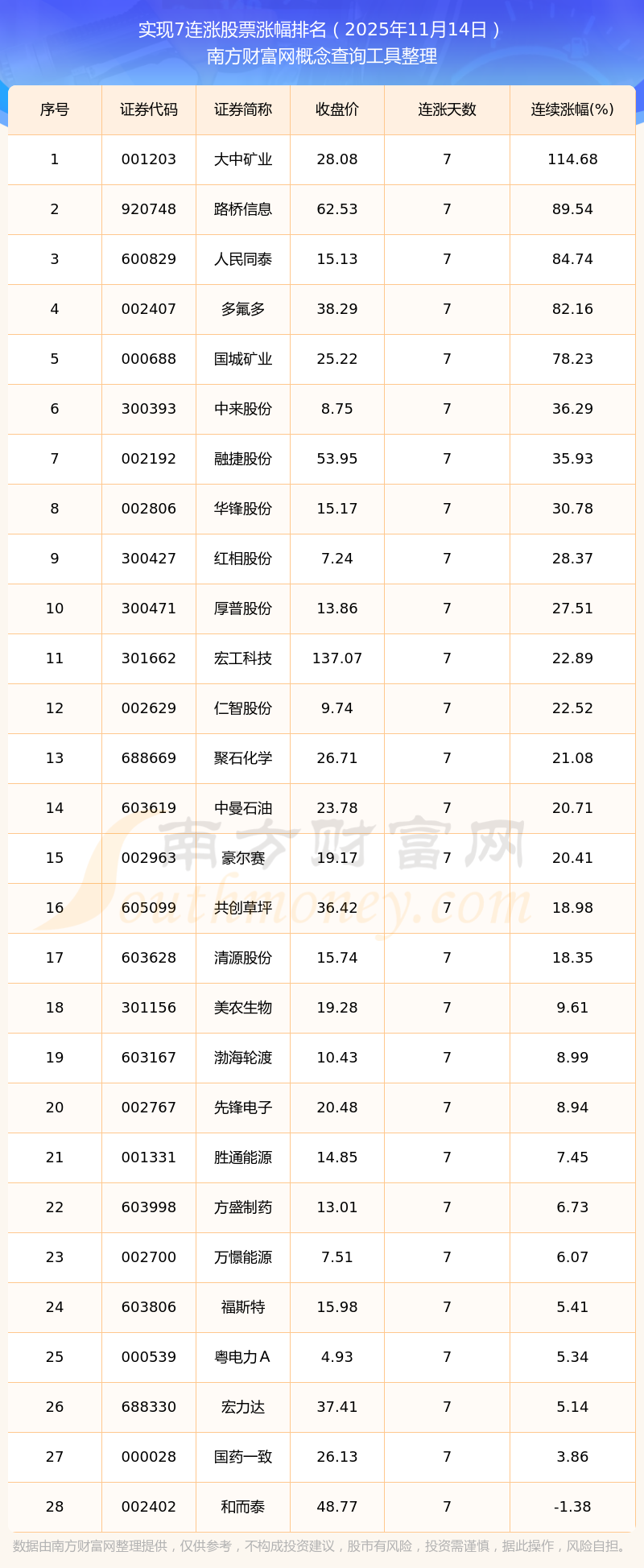 2025年11月14日實(shí)現(xiàn)7連漲股票漲幅排名