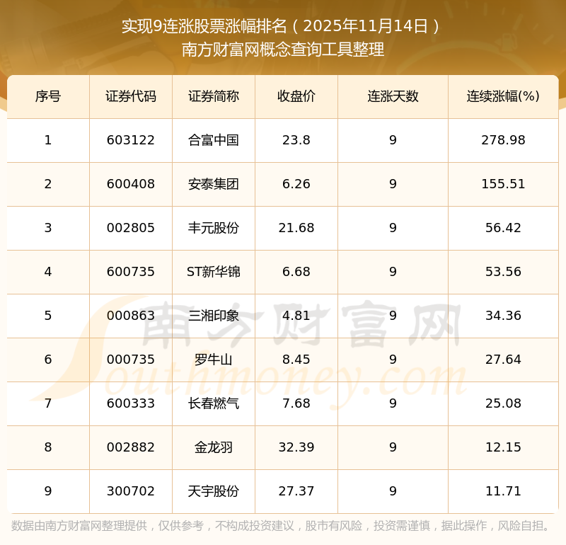 2025年11月14日實(shí)現(xiàn)9連漲股票漲幅排名