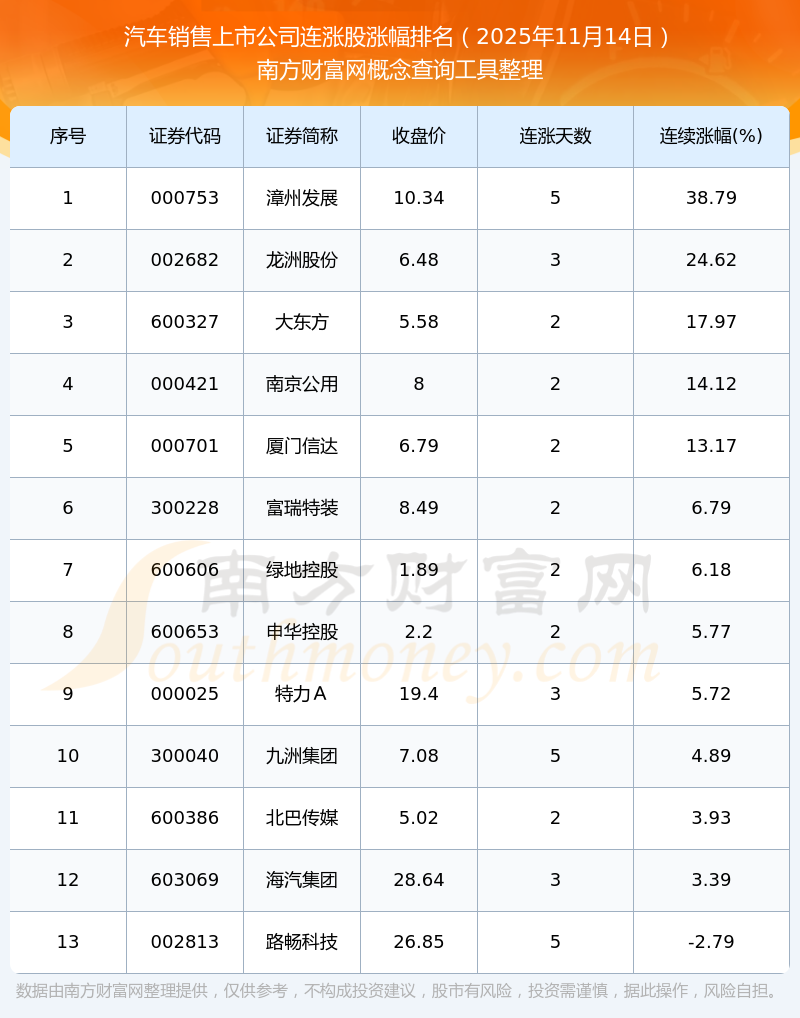根據(jù)南方財富網(wǎng)概念查詢工具數(shù)據(jù)統(tǒng)計(jì),截止2025年11月14日收盤,汽車銷售上市公司共有13只個股實(shí)現(xiàn)連漲。其中連續(xù)漲幅較大的個股有漳州發(fā)展、龍洲股份、大東方等,連續(xù)漲幅分別為38.79%、24.62%、17.97%。