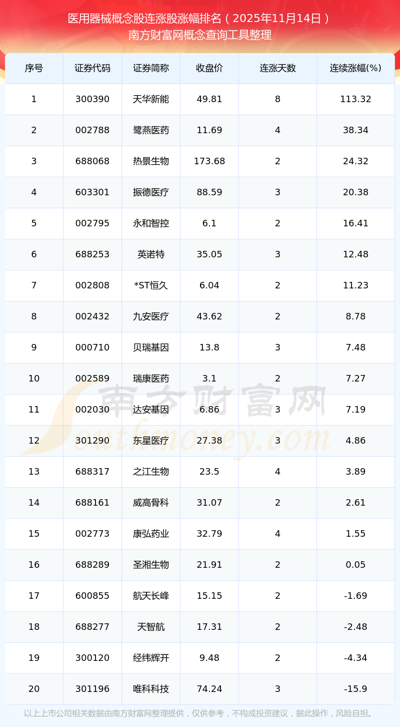 2025年11月14日醫(yī)用器械概念股連漲股漲幅排名